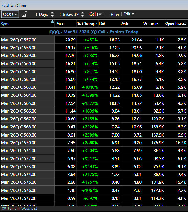 The QQQ Mar 31 $570 Call opened Tuesday worth pennies and closed up +2880%.