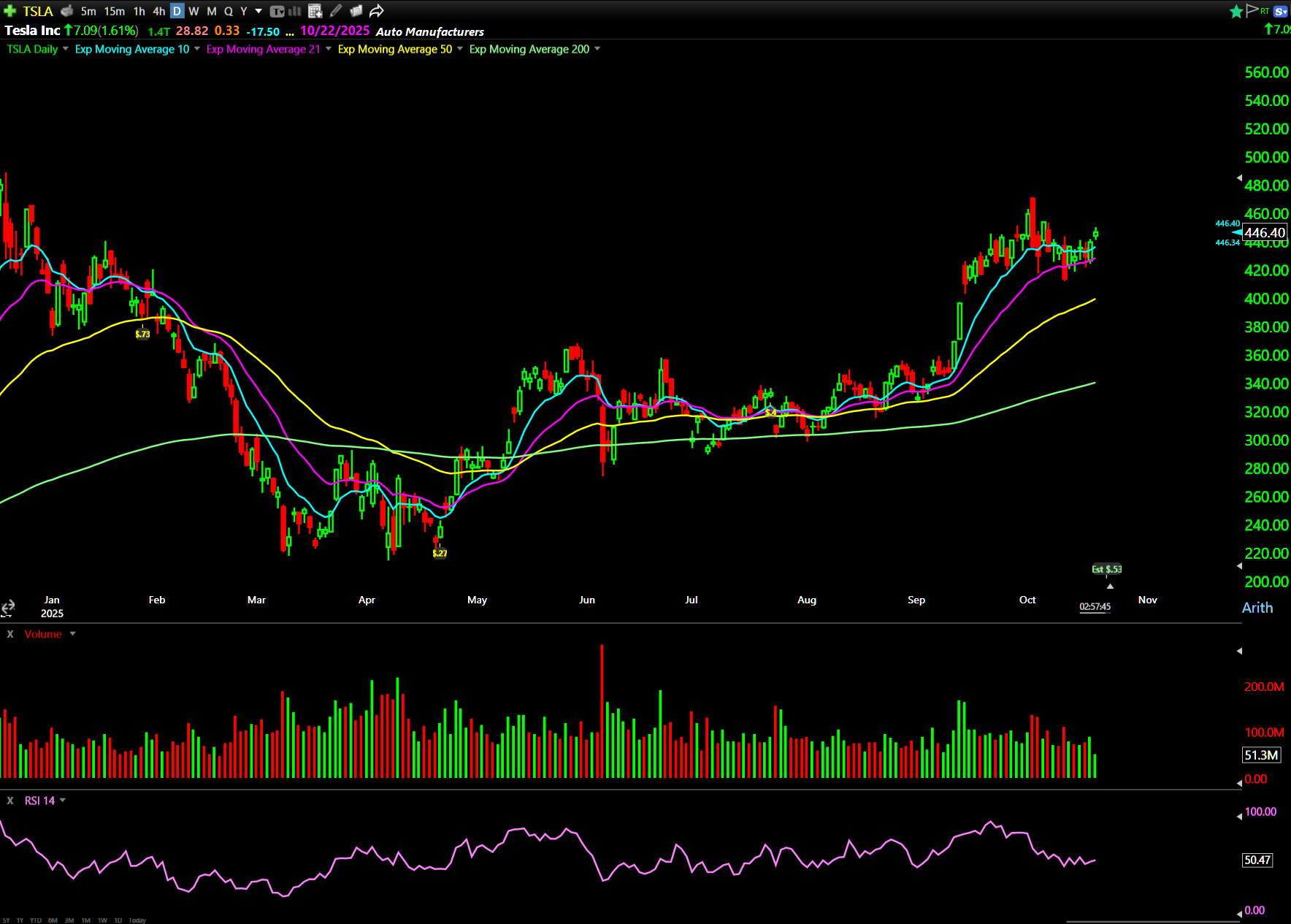 Tesla’s reporting earnings tomorrow. The chart is showing a “run-rest-run” pattern, one of my favorites for an imminent breakout.