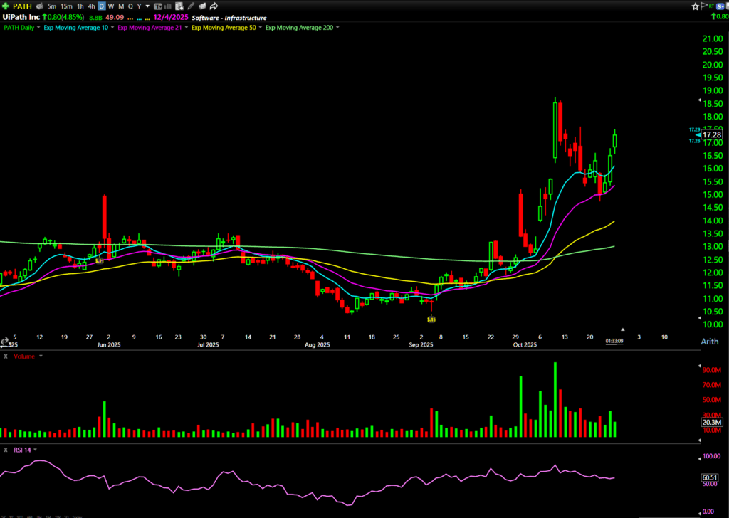 There’s been a ridiculous amount of January call buying on PATH. Set an alert at $17.20 for the January 17 $20 Calls. Smart Money is positioning for a move higher into year-end.