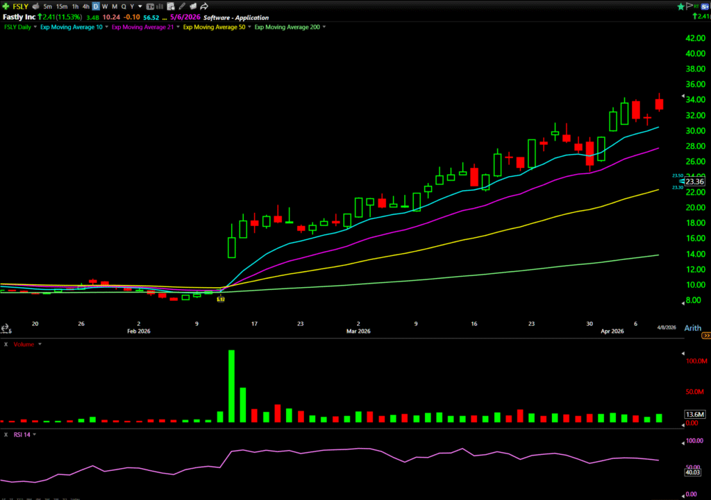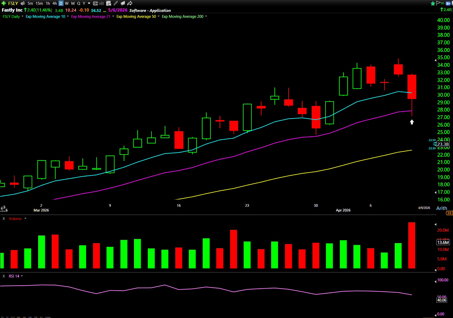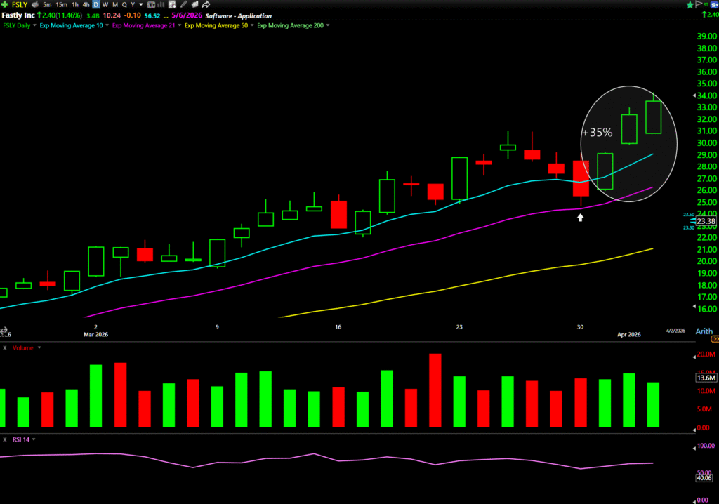 Then on April 9th, FSLY tested the 21-day EMA intraday, broke briefly below it, and reversed hard into the close. A clean pullback with perfectly defined risk (and 25% upside to the all-time highs).