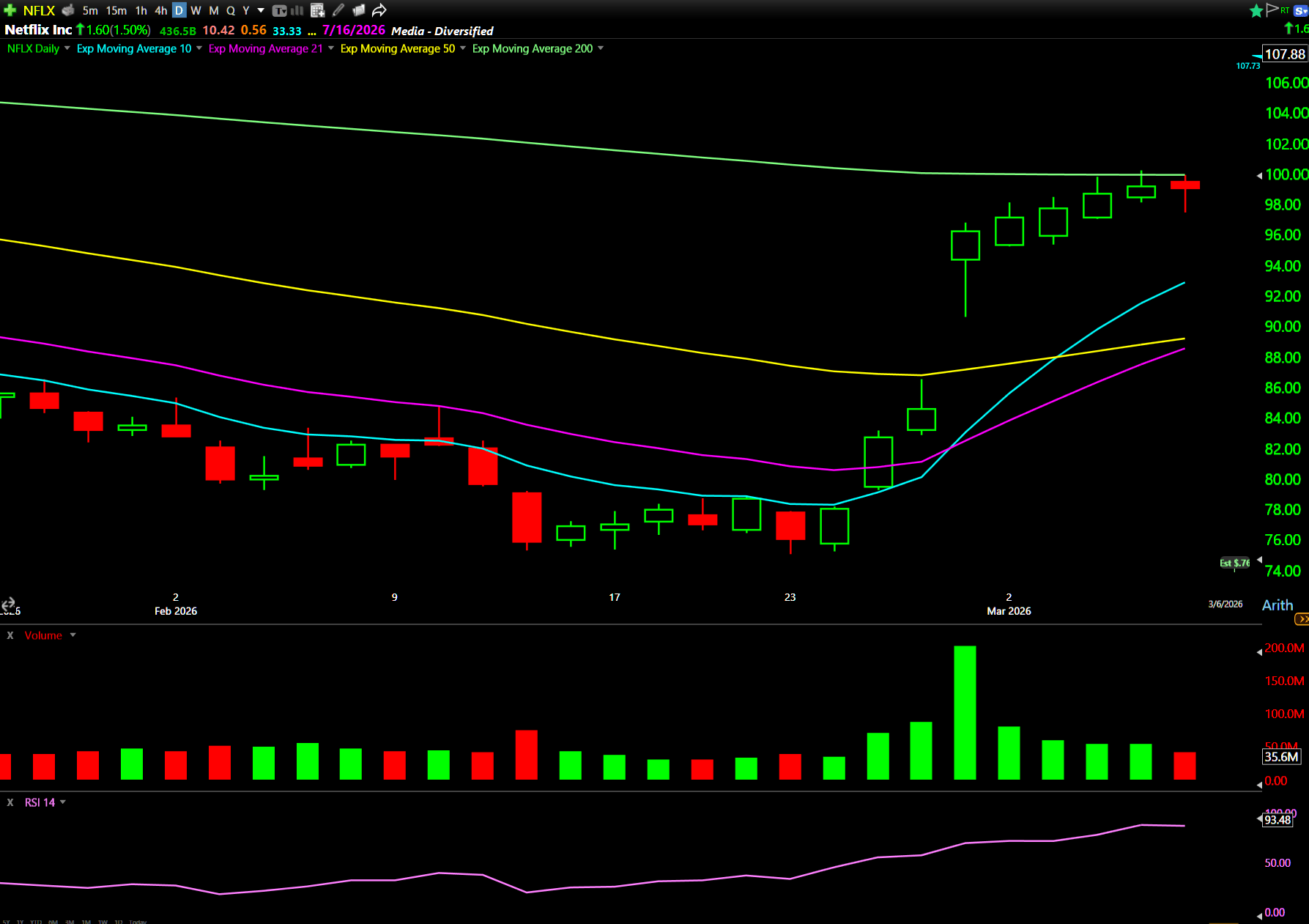 Netflix Inc. (NASDAQ: NFLX) showed the same pattern just a few weeks ago. NFLX gapped 14% overnight on February 26th and ran higher for six straight sessions.