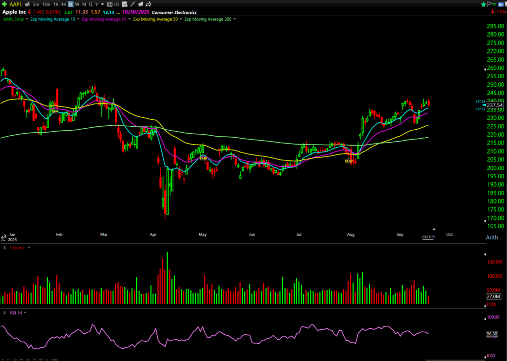 Apple’s range broke up to $240.83, then came back down to $239. I like an entry around $239 with a stop below $238.50. Create the alert above $240 for the September 19 $240 Calls. The dynamic watchlist will trigger when $240 breaks.