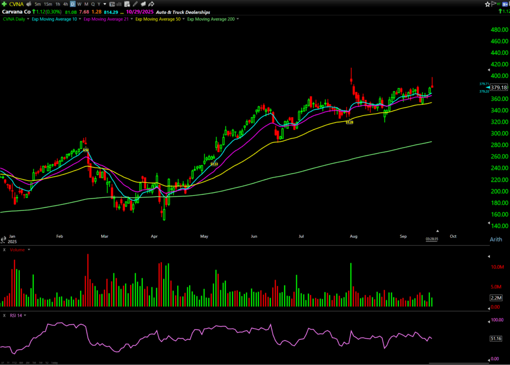 CVNA has been one of the strongest stocks in the market this year. If it breaks above $387.50, I like the September 19 $392.50 Call. Yesterday’s scanner showed massive activity — over $100,000 ask hits with multiple repeaters. Had you bought the $385 Calls yesterday, you’d be sitting pretty.