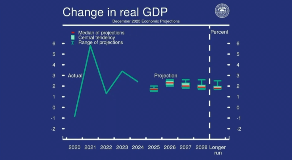 The SEP median rate projection shows 3.4% for 2026 and 3.1% for 2027, unchanged from September.