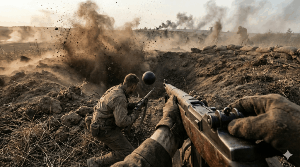Dust kicks up around your position. Your heart pounds against your ribs. Your hands shake as you grip your rifle.