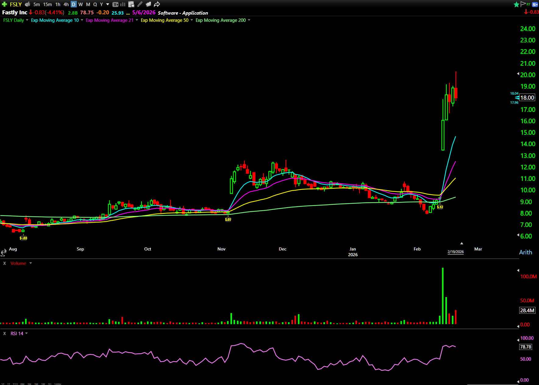 Running since earnings. Doubled from $8 to $16+. If Fastly can get over $19.20, it still has gas in the tank. The $18.50 calls were getting hammered yesterday. Stock’s still holding above $18.50 this morning.