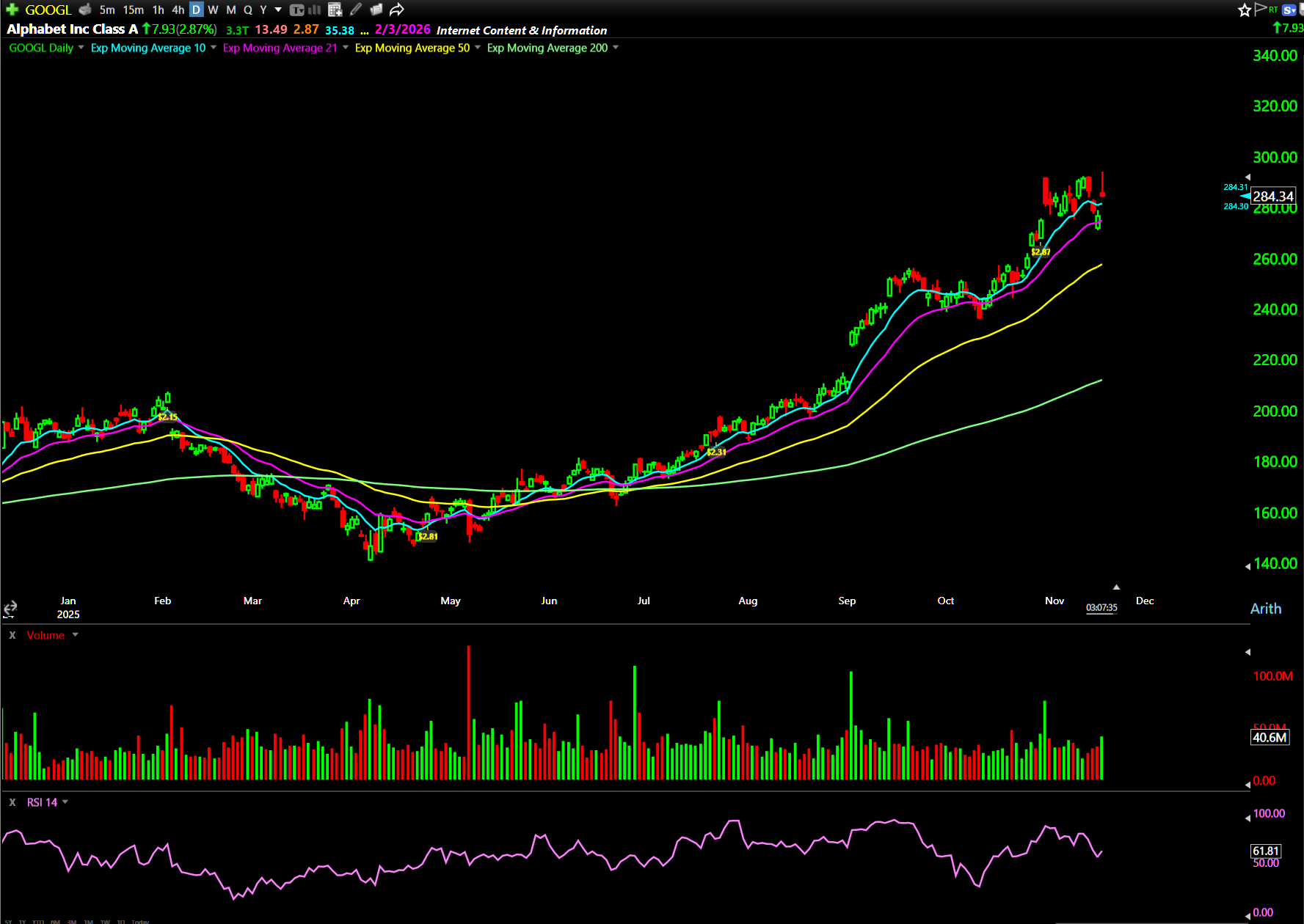 I’m watching $283.50 for a bounce. If GOOGL holds that level, I like November 21 $285 Calls, November 21 $290 Calls, and November 21 $295 Calls.