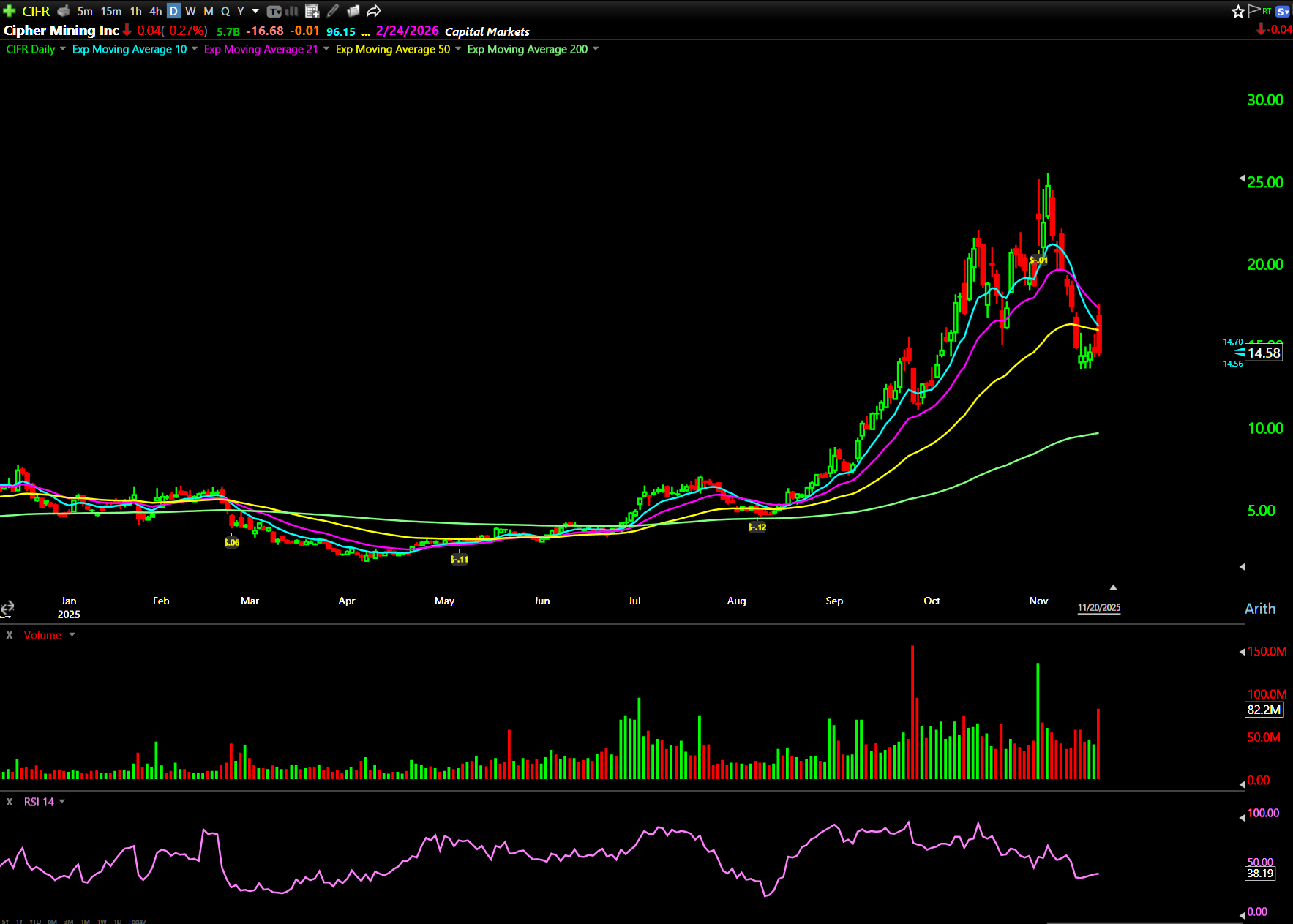 The chart shows CIFR sitting on a shelf at $14 with near-term upside to $17.50.