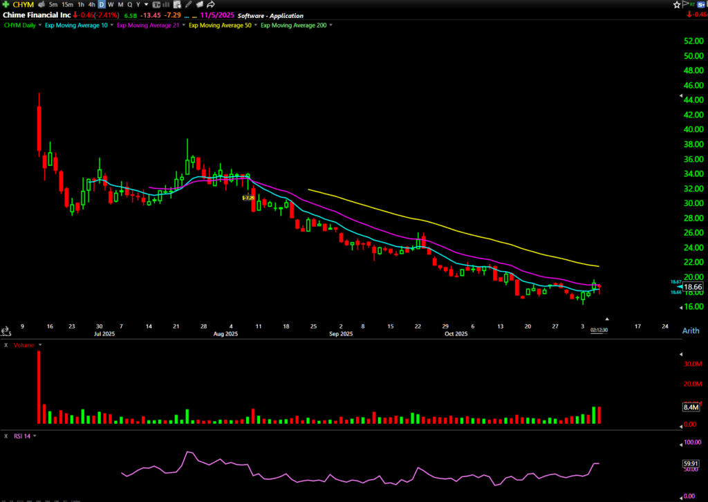 Strong support near $16, breakout watch above $19.50. If CHYM clears that resistance, I’m looking at December 19 $20 Calls.