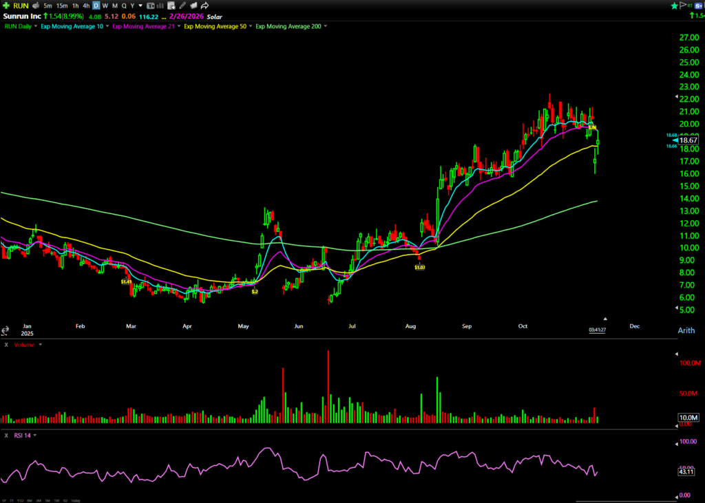 Solar company Sunrun pulled in big block orders Friday after a post-earnings dip.