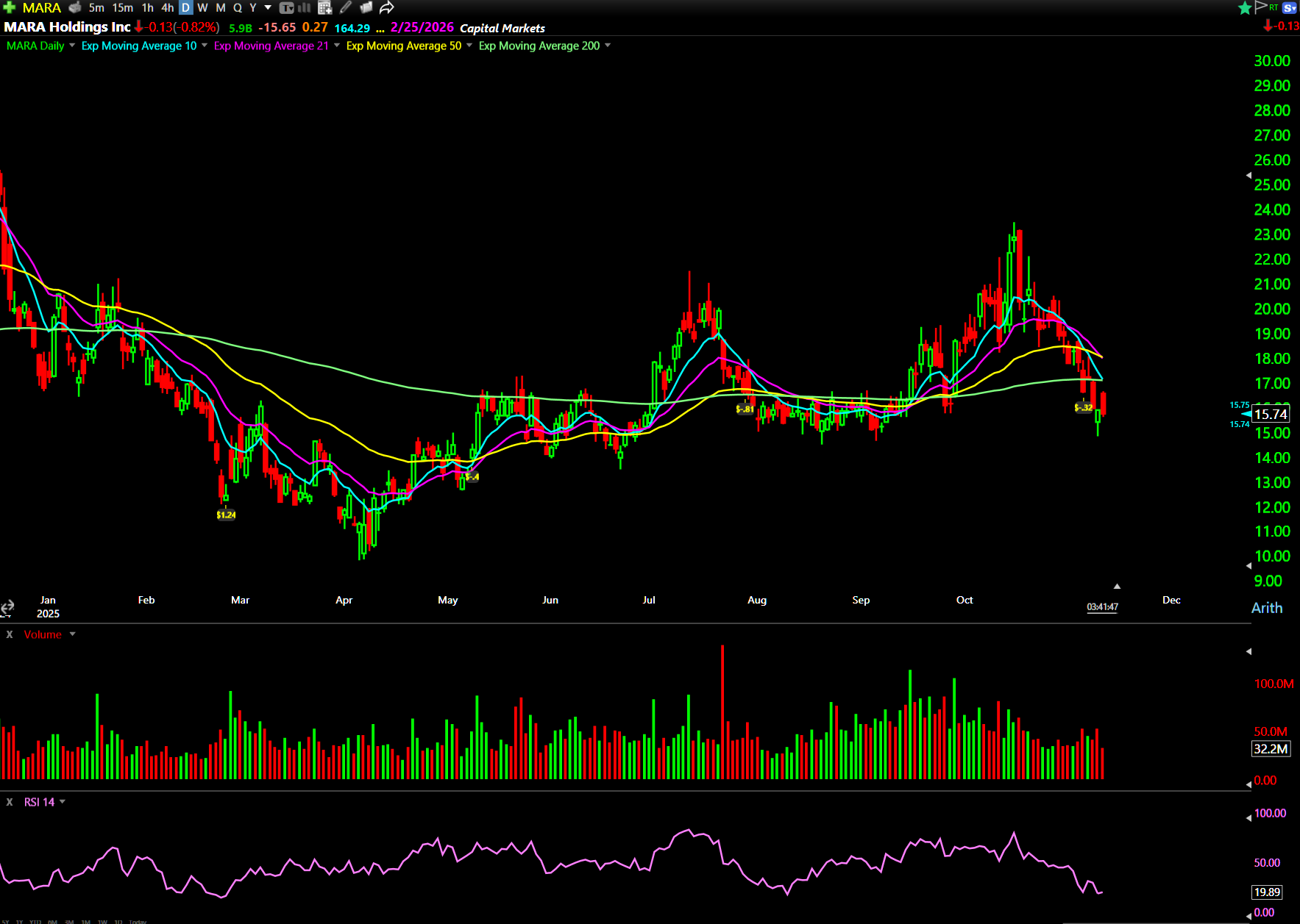 Bitcoin miner MARA is forming a tight consolidation range near major support at $15.