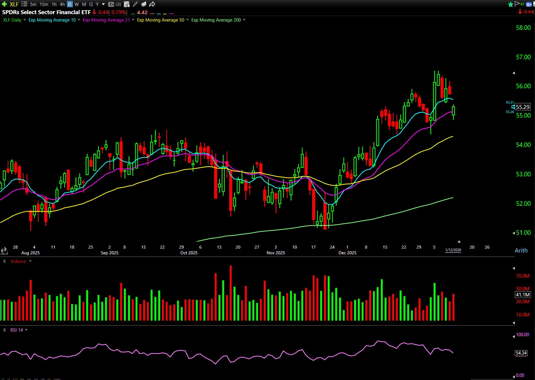 XLF is pulling back into the 8 EMA / 21 EMA risk zone: